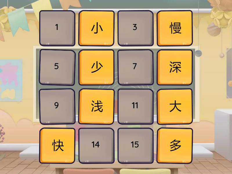 快 - 慢, 大 - 小, 深 - 浅, 多 - 少, 来 - 去, 出 - 进, 前 - 后, 高 - 低,