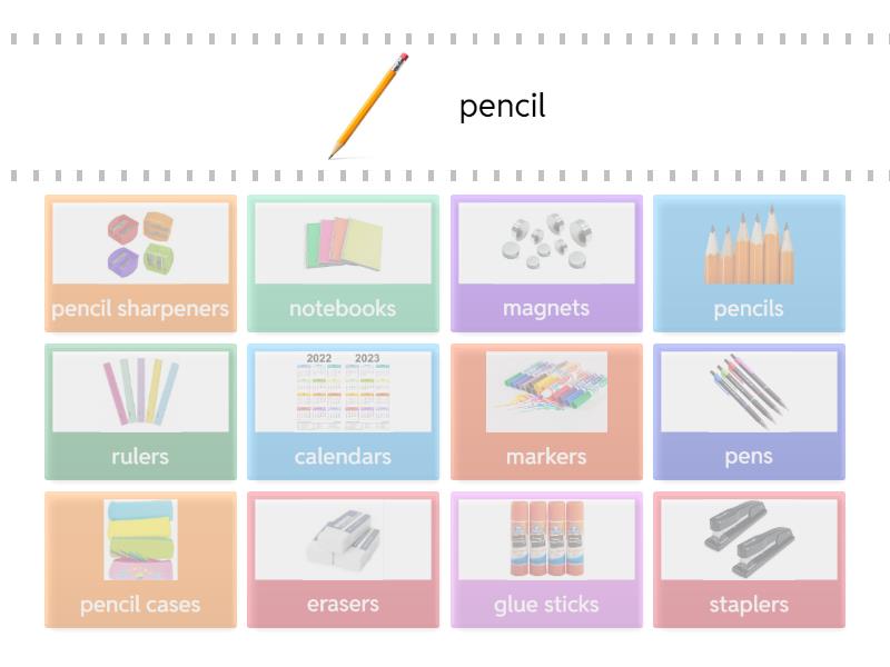 pencils - pencil, erasers - eraser, pencil cases - pencil case, rulers - ruler, glue sticks - glue stick, pens - pen, notebooks - notebook, markers - marker, magnets - magnet, calendars - calendar, staplers - stapler, pencil sharpeners - pencil sharpener,