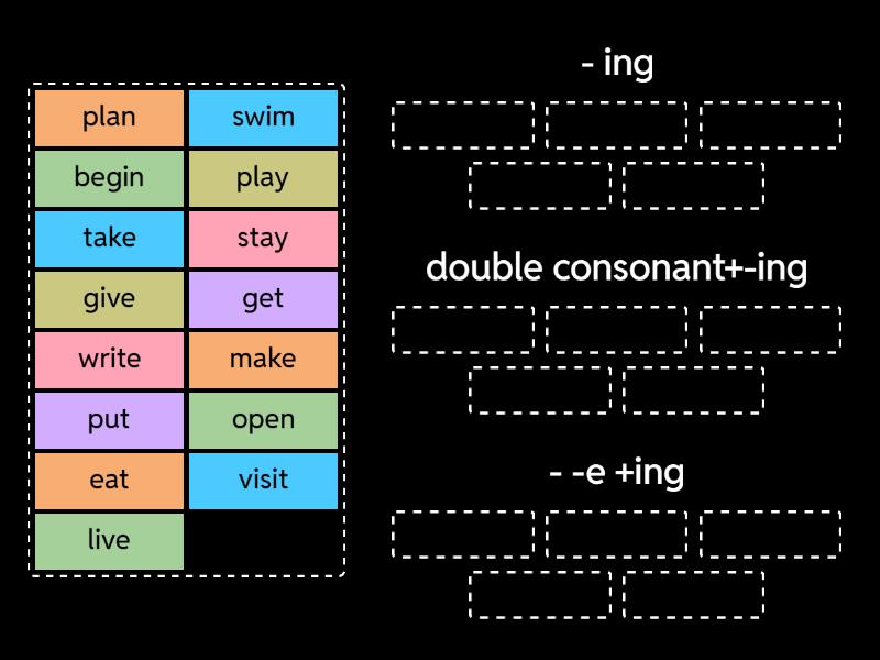 - ing: open, play, eat, visit, stay, double consonant+-ing: swim, get, plan, begin, put, - -e +ing : live, make, give, take, write,