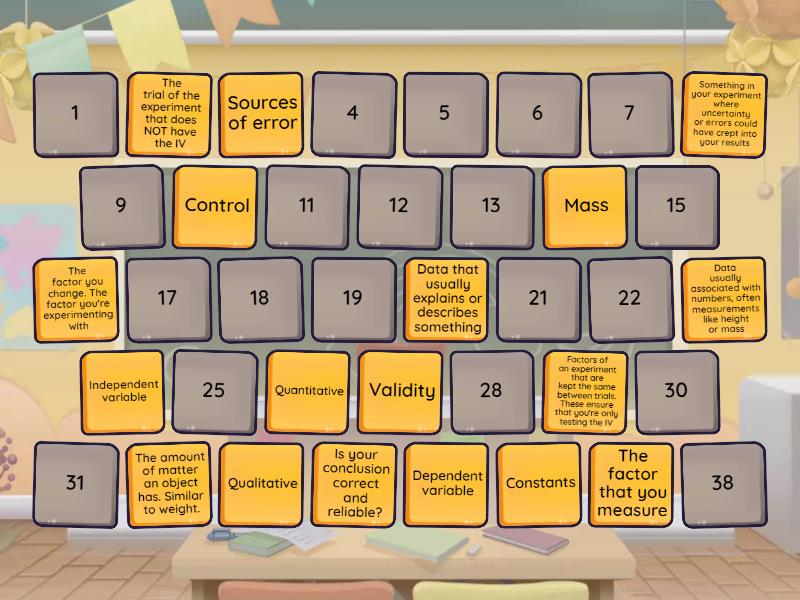 Independent variable - The factor you change. The factor you're experimenting with, Dependent variable - The factor that you measure, Constants - Factors of an experiment that are kept the same between trials. These ensure that you're only testing the IV, Control - The trial of the experiment that does NOT have the IV, Sources of error - Something in your experiment where uncertainty or errors could have crept into your results, Qualitative - Data that usually explains or describes something, Quantitative - Data usually associated with numbers, often measurements like height or mass, Validity - Is your conclusion correct and reliable?, Mass - The amount of matter an object has. Similar to weight., Volume - The amount of space something takes up. A cube has this, but a square does not., Degrees Celsius (°C) - Metric measurement unit of temperature, Meter (m) - The standard metric unit of length, Liter (l) - The standard metric unit of volume, Gram (g) - The standard metric unit of mass, System Internationale (SI) - The official name of "the metric system", x-axis - The horizontal part of a graph, y-axis - The vertical part of a graph, Inference - A conclusion you draw from experimental data or other information, Meniscus - A small amount of water that creeps up the side of glass, caused by water's adhesion,
