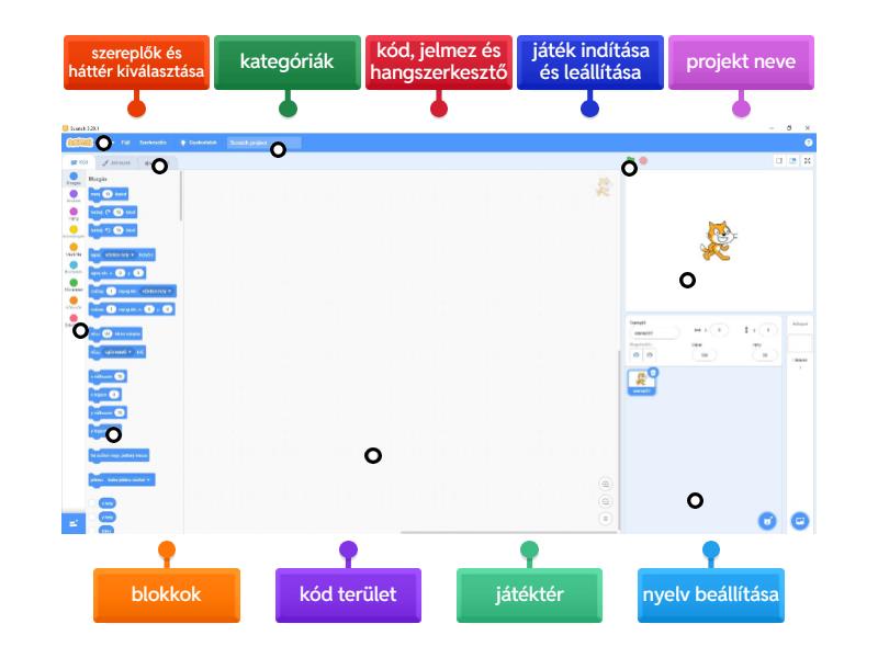 nyelv beállítása, kód, jelmez és hangszerkesztő, blokkok, kategóriák, projekt neve, játék indítása és leállítása, játéktér, szereplők és háttér kiválasztása, kód terület.