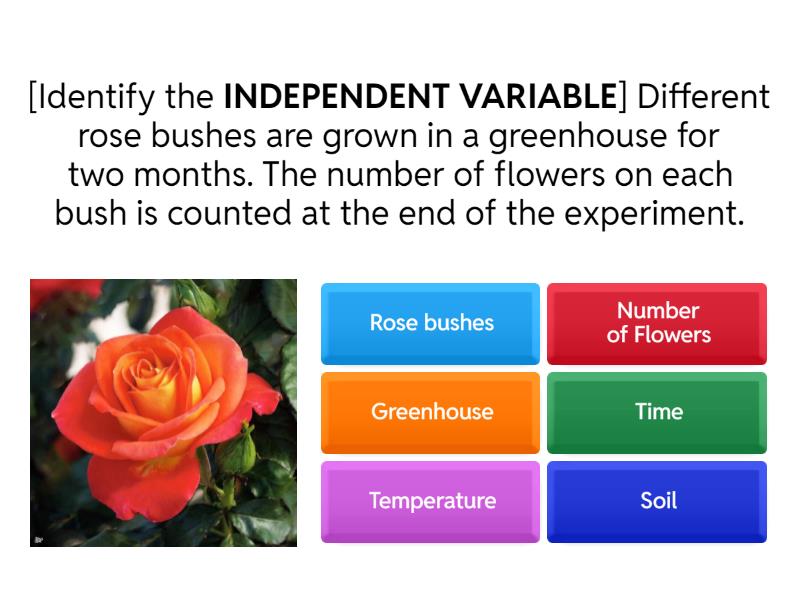 1) [Identify the INDEPENDENT VARIABLE] Different rose bushes are grown in a greenhouse for two months. The number of flowers on each bush is counted at the end of the experiment.  a) Rose bushes b) Number of Flowers c) Greenhouse d) Time e) Temperature f) Soil 2) [Identify the DEPENDENT VARIABLE] Different rose bushes are grown in a greenhouse for two months. The number of flowers on each bush is counted at the end of the experiment.  a) Rose bushes b) Number of Flowers c) Greenhouse d) Time e) Temperature f) Soil 3) [Identify the CONSTANTS] Different rose bushes are grown in a greenhouse for two months. The number of flowers on each bush is counted at the end of the experiment.   a) Rose bushes b) Number of flowers c) Greenhouse d) Time e) Temperature f) Soil 4) [Identify the INDEPENDENT VARIABLE] You water three sunflower plants with salt water. Each plant receives a different concentration of salt solutions. After a two-week period, the height is measured.   a) Time b) Concentration of Salt Solution c) Location d) Measurement tool e) Height f) Type of Sunflower plant 5) [Identify the DEPENDENT VARIABLE] You water three sunflower plants with salt water. Each plant receives a different concentration of salt solutions. After a two-week period, the height is measured.  a) Time b) Concentration of Salt Solution c) Location d) Measurement tools e) Height f) Type of Sunflower plant 6) [Identify the CONSTANTS] You water three sunflower plants with salt water. Each plant receives a different concentration of salt solutions. After a two-week period, the height is measured.  a) Time b) Concentration of Salt Solution c) Location d) Measurment tools e) Height f) Type of Sunflower plant 7) [Identify the CONSTANTS] Two teams of 7th grade students are running the mile. One team was given starburst candy. The running times were recorded as each student crossed the finish line.   a) grade level of students b) running track location c) running times of students d) starting and finishing lines e) starburst candy f) running distance of 1 mile 8) [Identify the DEPENDENT VARIABLE] Two teams of 7th grade students are running the mile. One team was given starburst candy. The running times were recorded as each student crossed the finish line.  a) grade level of students b) running track location c) running times of students d) starting and finishing lines e) starburst candy f) running distance of 1 mile 9) [Identify the INDEPENDENT VARIABLE] Two teams of 7th grade students are running the mile. One team was given starburst candy. The running times were recorded as each student crossed the finish line.  a) grade level of students b) running track location c) running times of students d) starting and finishing lines e) starburst candy f) running distance of 1 mile