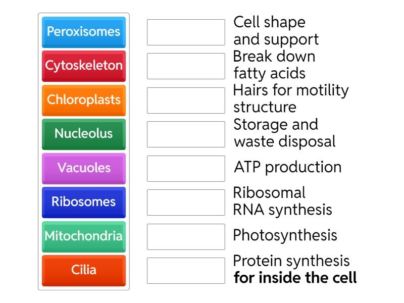Nucleus - Contains DNA, Nucleolus - Ribosomal RNA synthesis, Ribosomes - Protein synthesis for inside the cell, Rough Endoplasmic Reticulum - Protein synthesis for secretion, Smooth Endoplasmic Reticulum - Lipid synthesis, Golgi Apparatus - Protein modification, Mitochondria - ATP production, Chloroplasts - Photosynthesis, Lysosomes - Hydrolytic enzymes, Vacuoles - Storage and waste disposal, Peroxisomes - Break down fatty acids, Cytoskeleton - Cell shape and support, Centrosomes - Microtubule organization, Cilia - Hairs for motility structure, Flagella - Tail for Motility structure, Nuclear Envelope - Surrounds nucleus,