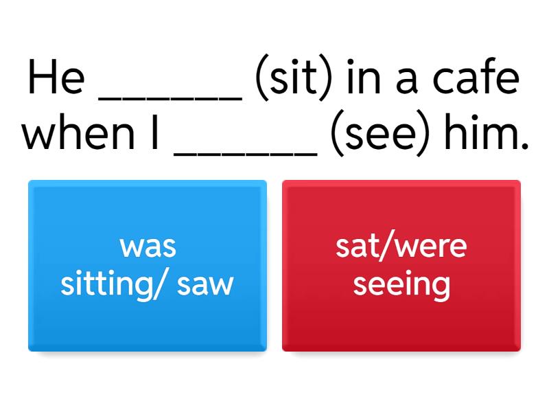 1) He ______ (sit) in a cafe when I ______ (see) him. a) was sitting/ saw b) sat/were seeing 2) When I ________ (go out) the sun ________ (shine). a) were going out / shone b) went out/ was shining 3) The boy ______ (run) when he ______ (fall). a) was running/were falling down b) was running/fell down 4) When the war ______ (begin) we ______ (live) in London. a) was beginning/was living b) began/were living 5) I ______ (have) tea when the lights ______ (go out). a) was having/went out b) were having/was going out 6) My friends ______ (sing) when I ______ (come) into the room. a) was singing/was coming b) were singing/came 7) While you  ______ (play) the piano I ______ (write) a letter. a) were playing/were writing b) were playing/was writing 8) He ______ (eat) his dinner when I ______ (arrive). a) ate/were arriving b) was eating/arrived 9) She ______ (study) at school when the earthquake ___________ (happen). a) study/happen b) was studying/happened 10) When the phone ______ (ring) I ______ (have) a bath. a) was ringing/were having b) rang/was having 11) They ______ (ski) when they ________ (see) an avalanche. a) was skiing / saw b) were skiing/ saw