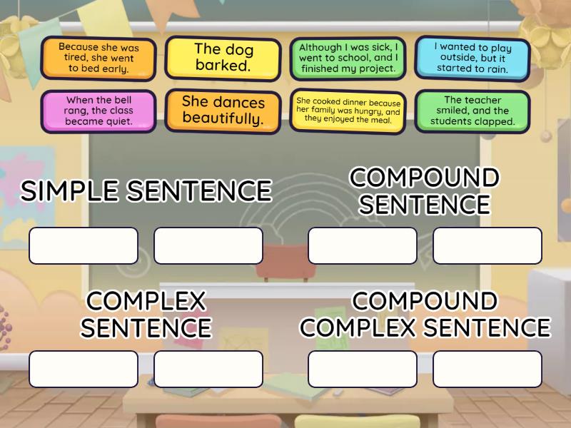 SIMPLE SENTENCE: The dog barked., She dances beautifully., COMPOUND SENTENCE: I wanted to play outside, but it started to rain., The teacher smiled, and the students clapped., COMPLEX SENTENCE: Because she was tired, she went to bed early., When the bell rang, the class became quiet., COMPOUND COMPLEX SENTENCE: Although I was sick, I went to school, and I finished my project., She cooked dinner because her family was hungry, and they enjoyed the meal.,