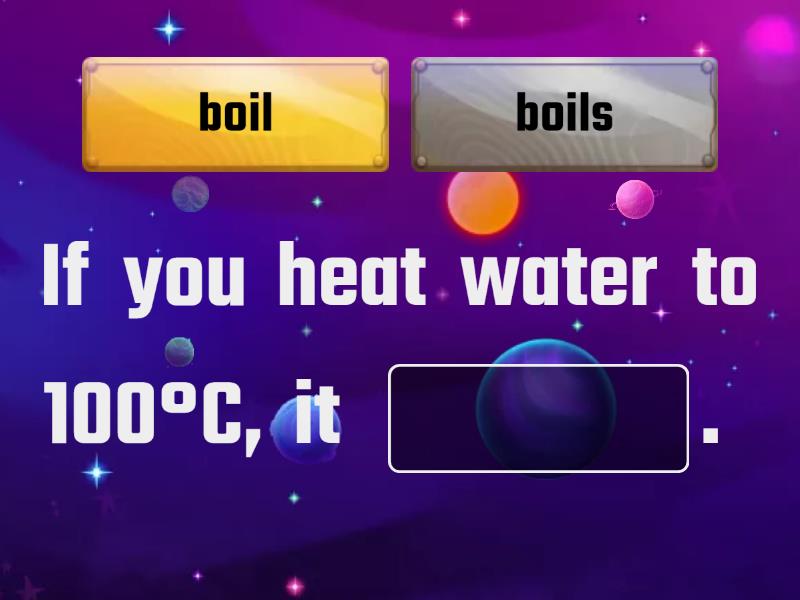 If you heat water to 100°C, it ____. If you drop ice in the sun, it ____. If it rains, the grass ____ wet. If you don’t water plants, they ____. If you mix blue and yellow, you ____ green. If people don’t sleep, they ____ tired. If you press this button, the computer ____ on. If the teacher speaks fast, students ____ If you eat too much sugar, you ____ cavities. If you don’t wear sunscreen, you ____ sunburned.