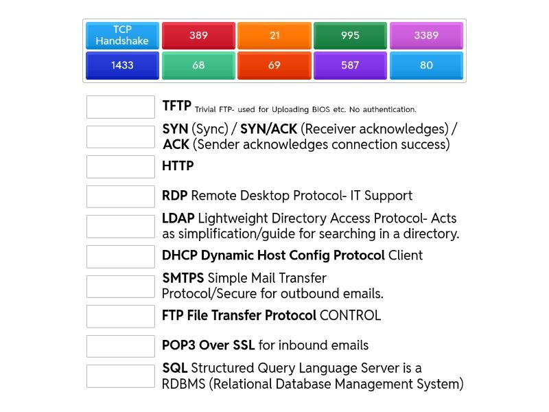 20 - FTP File Transfer Protocol DATA, 21 - FTP File Transfer Protocol CONTROL, 22 - SSH Secure Shell (Encrypted!) SFTP is a SSH extension for FTP, 23 - Telnet Virtual Terminal Connection- not secure, 53 - DNS Domain Name System Translates IPs/Names, 67 - DHCP Dynamic Host Config Protocol Server, 68 - DHCP Dynamic Host Config Protocol Client, 69 - TFTP Trivial FTP- used for Uploading BIOS etc. No authentication., 80 - HTTP, 443 - HTTPS, 110 - POP3 for inbound emails, 995 - POP3 Over SSL for inbound emails, 143 - IMAP for sync'd inbound emails., 993 - IMAP Over SSL for sync'd inbound emails., 25 - SMTP Simple Mail Transfer Protocol/Secure for outbound emails., 587 - SMTPS Simple Mail Transfer Protocol/Secure for outbound emails., 123 - NTP Network Time Protocol for syncing clocks on network., 161 - SNMP Server - Simple Network Management Protocol. V1,V2 bad- V3 good., 162 - SNMP Client - Simple Network Management Protocol. V1,V2 bad- V3 good., 389 - LDAP Lightweight Directory Access Protocol- Acts as simplification/guide for searching in a directory., 636 - LDAPS Lightweight Directory Access Protocol- Acts as simplification/guide for searching in a directory., 445 - SMB Server Message Block- File Sharing on local network, not need for NETBIOS over TCP/IP., 514 - Syslog Message Logging, 1433 - SQL Structured Query Language Server is a RDBMS (Relational Database Management System), 3389 - RDP Remote Desktop Protocol- IT Support, 5060 - SIP Session Initiation Protocol - Think about voice calls/big sessions., 5061 - SIPS Session Initiation Protocol - Think about voice calls/big sessions., ICMP - Internet Control Message Protocol.. Think PING, TCP Handshake - SYN (Sync) / SYN/ACK (Receiver acknowledges) / ACK (Sender acknowledges connection success),