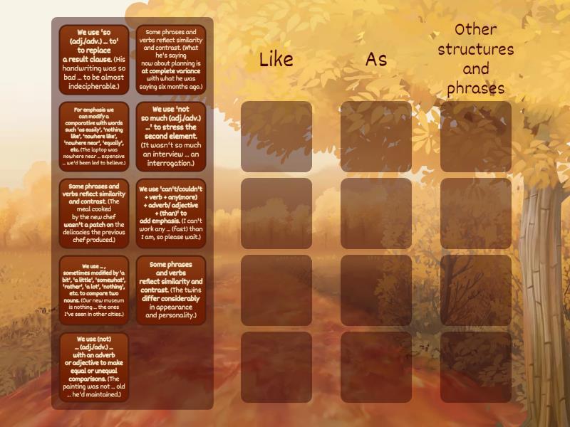 Like: We use ... , sometimes modified by 'a bit', 'a little', 'somewhat', 'rather', 'a lot', 'nothing', etc. to compare two nouns. (Our new museum is nothing ... the ones I've seen in other cities.), As: We use (not) ... (adj./adv.) ... with an adverb or adjective to make equal or unequal comparisons. (The painting was not ... old ... he'd maintained.), For emphasis we can modify a comparative with words such 'as easily', 'nothing like', 'nowhere like', 'nowhere near', 'equally', etc. (The laptop was nowhere near ... expensive ... we'd been led to believe.), We use 'so (adj./adv.) ... to' to replace a result clause. (His handwriting was so bad ... to be almost indecipherable.), We use 'not so much (adj./adv.) ...' to stress the second element. (It wasn't so much an interview ... an interrogation.), Other structures and phrases: We use 'can't/couldn't + verb + any(more) + adverb/ adjective + (than)' to add emphasis. (I can't work any ... (fast) than I am, so please wait.), Some phrases and verbs reflect similarity and contrast. (The meal cooked by the new chef wasn't a patch on the delicacies the previous chef produced.), Some phrases and verbs reflect similarity and contrast. (The twins differ considerably in appearance and personality.), Some phrases and verbs reflect similarity and contrast. (What he's saying now about planning is at complete variance with what he was saying six months ago.),