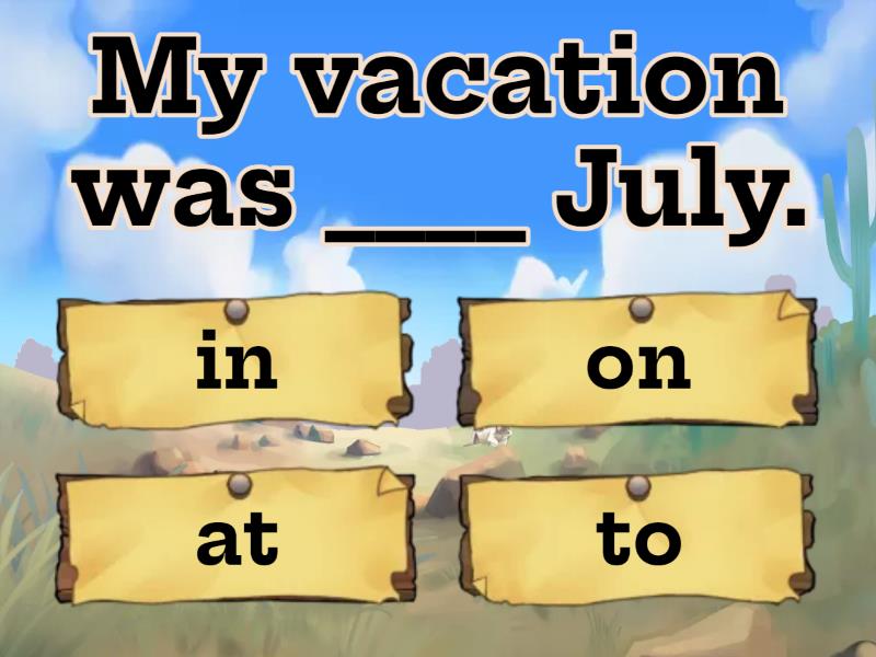 1) My vacation was ____ July. a) in b) on c) at d) to 2) Lucy isn't ____ home. She's ____ her office. a) at - at b) in - in c) in - at d) at - on 3) I have classes ____ Mondays and Wednesdays. a) in b) at c) on d) from 4) I work _____ an office. a) in b) at c) on d) to 5) I always go to the beach _____ the weekend. a) at b) in c) on d) from 6) I don't usually have lunch ____ midday, I have it later. a) on b) in c) at d) to 7) My cousins love to play _____ the street, especially basketball. a) in b) at c) on d) from 8) I always have dinner ____ work. a) at b) in c) on d) to 9) A: Where are you _____, Jasmine? B: I'm from the Netherlands. a) at b) in c) on d) from 10) Lyndsay isn't ____ her office. Has she already left? a) from b) on c) in d) to 11) I can't talk now, I'm _____ the post office. a) in b) at c) on d) from 12) Josh is _____ Dundee, Scotland. a) at b) to c) from d) on 13) I'm _____ work _____ 8:00 a.m. _____ 2:00 p.m. a) at - from - to b) from - to - at c) to - at - from d) to - from - at