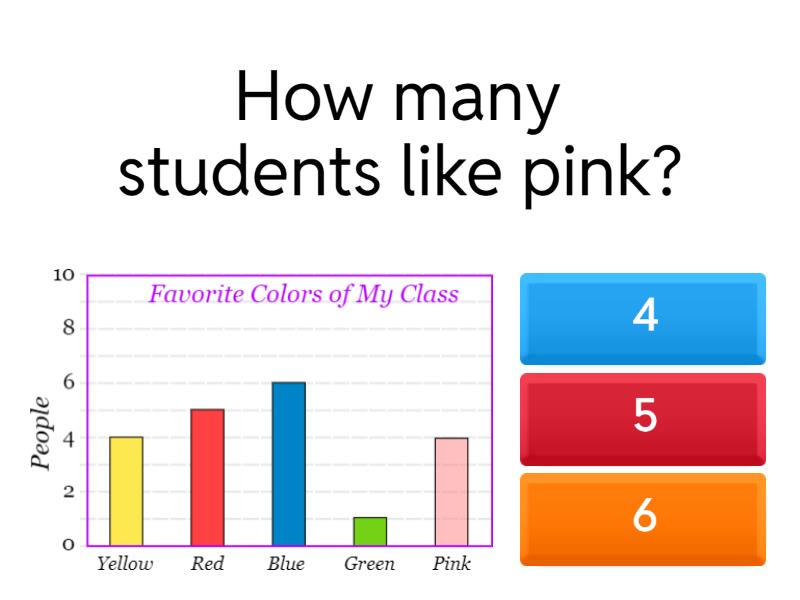 1) How many students like pink? a) 4 b) 5 c) 6 2) How many students like blue? a) 4 b) 5 c) 6 3) What colour do students like the least? a) blue b) green c) red 4) What colour do students like the most? a) blue b) green c) red 5) How many students like red and yellow? a) 7 b) 9 c) 8 6) How many students like green and blue? a) 7 b) 9 c) 8 7) Challenge: How many more students like blue than pink? a) 3 b) 1 c) 2