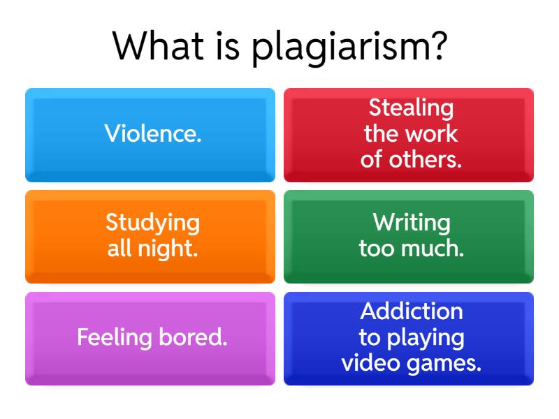 1) What is plagiarism? a) Violence. b) Stealing the work of others. c) Studying all night. d) Writing too much. e) Feeling bored. f) Addiction to playing video games. 2) Plagiarism is illegal a) True b) False 3) What information do you need to include about a printed source? a) Whether it is a book or a website. b) Author's name, date, title, publisher. c) website address d) Whether it is true. e) Your opinion about it. f) Easy or difficult to read. 4) What kind of punctuation do you use when you quote directly? a) CAPITAL LETTERS b) Start a new line. c) Speech marks " " at beginning and end. d) colon: e) Full stop. f) semi-colon. 5) What information do you include when referencing an online source? a) Title, website name, year of publication. b) Author's name, article title. c) Author's name, date, article title, website name, website address. d) Author's name, publisher, date. e) Website name, time. f) Your opinion about it. 6) Your list of resources should be at the beginning of your assignment? a) True b) False 7) How should your list of resources be organised? a) in Tahoma font b) all in italics c) There is no specific organisation for it. d) in alphabetical order