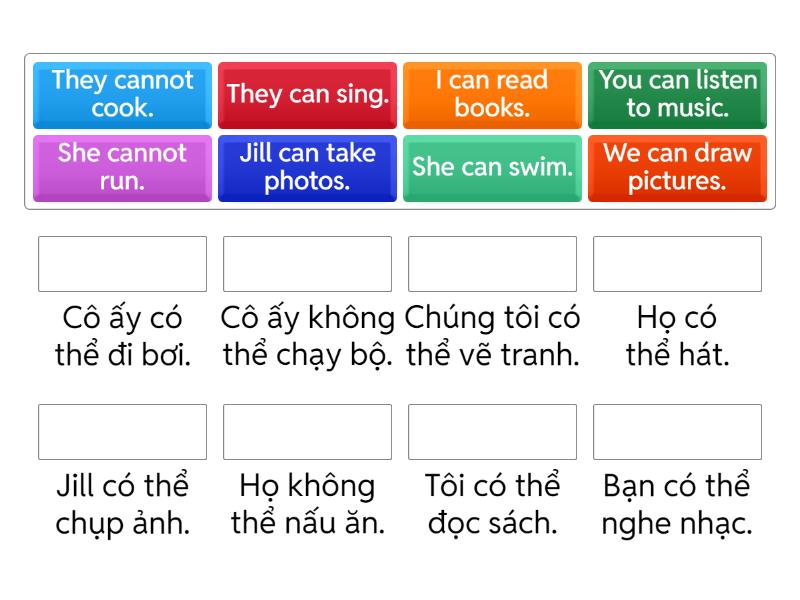 I can read books. - Tôi có thể đọc sách., I cannot watch TV. - Tôi không thể xem TV., You can listen to music. - Bạn có thể nghe nhạc., You cannot play games. - Bạn không thể chơi trò chơi., He can play football. - Anh ấy có thể chơi bóng đá., He cannot play badminton. - Anh ấy không thể chơi cầu lông., She can swim. - Cô ấy có thể đi bơi., She cannot run. - Cô ấy không thể chạy bộ., We can draw pictures. - Chúng tôi có thể vẽ tranh., We cannot dance. - Chúng tôi không thể nhảy múa., They can sing. - Họ có thể hát., They cannot cook. - Họ không thể nấu ăn., Alex can go fishing. - Alex có thể đi câu cá., Nick cannot go shopping. - Nick không thể đi mua sắm., Jill can take photos. - Jill có thể chụp ảnh.,