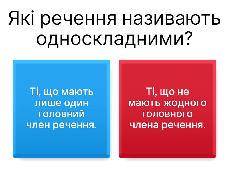 1) Які речення називають односкладними? a) Ті, що мають лише один головний член речення. b) Ті, що не мають жодного головного члена речення.  2) Які речення називають двоскладними? a) Ті, що мають лише підмет. b) Ті, що мають і підмет, і присудок. 3) У якому реченні підмет простий?  a) Мама і тато працюють. b) Пташка співає. 4) Яке речення двоскладне? a) Темно на вулиці. b) Діти грають у дворі. c) Весело. 5) Яке речення односкладне? a) Діти бігають по дворі. b) Кішка ловить мишу. c) Темніє. 6) Який підмет у реченні? Речення: пташка сіла на гілку. a) Пташка b) Сіла c) На гілку. 7) Який присудок у реченні? Речення: сонце сходить над горами. a) Сонце b) Сходить c) Горами