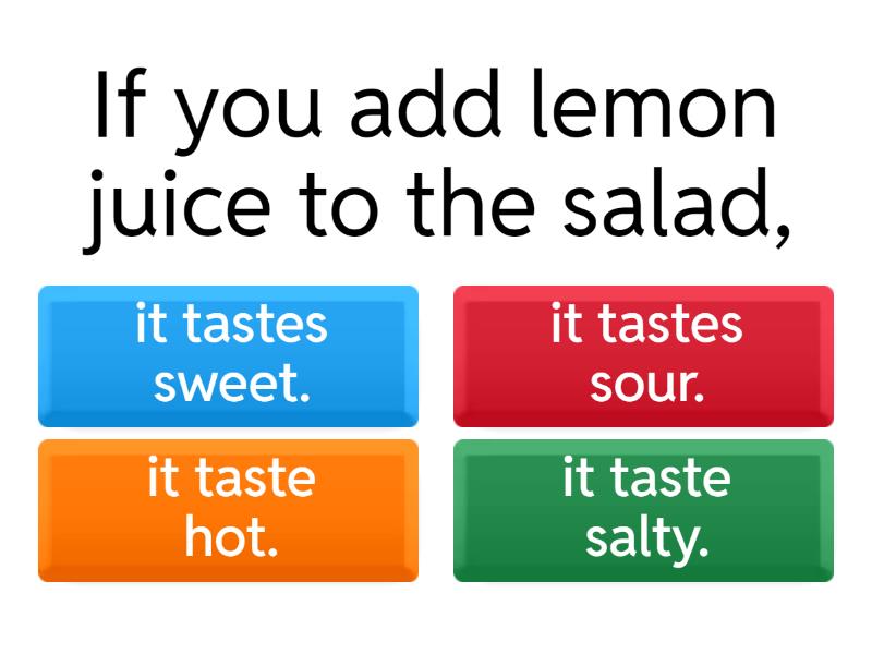1) If you add lemon juice to the salad, a) it tastes sweet. b) it tastes sour. c) it taste hot. d) it taste salty. 2) if you pull a dog's tail and hurt it, a) it bites you immediately.  b) it likes you very much. c) it goes to sleep. d) it eats some meat. 3) If it doesn't rain for a very long time, a) you get overweight. b) the weather is snowy. c) you get a cold.  d) the plants fade and dry. 4) If you leave margarine under the sun, a) it doesn't change. b) it freezes in a short time. c) it turns blue or red. d) it melts soon. 5) If you go to the north pole, a) you lose a lot of weight. b) you feel very hot and dry. c) you see a lot of snow and ice. d) you grow fruit and vegetables. 6) If you put an egg in the microwave, a) it becomes a lovely chick. b) you get a green egg. c) it explodes in a few seconds. d) you have a nice omelette. 7) If you visit Madam Tussaud's Museum, a) you see many wax figures. b) you buy some bread. c) you watch TV and relax. d) you sleep comfortably. 8) If your father's car breaks down, a) he goes home early. b) he has a barbecure. c) he drives it fast. d) he goes to the mechanic. 9) If she goes to work late, a) she gets a promotion. b) the boss gets angry. c) she earns more money. d) the boss becomes happy. 10) If you mix yellow and blue, a) you don't get anything. b) you get green. c) you go home early. d) you don't sleep well.