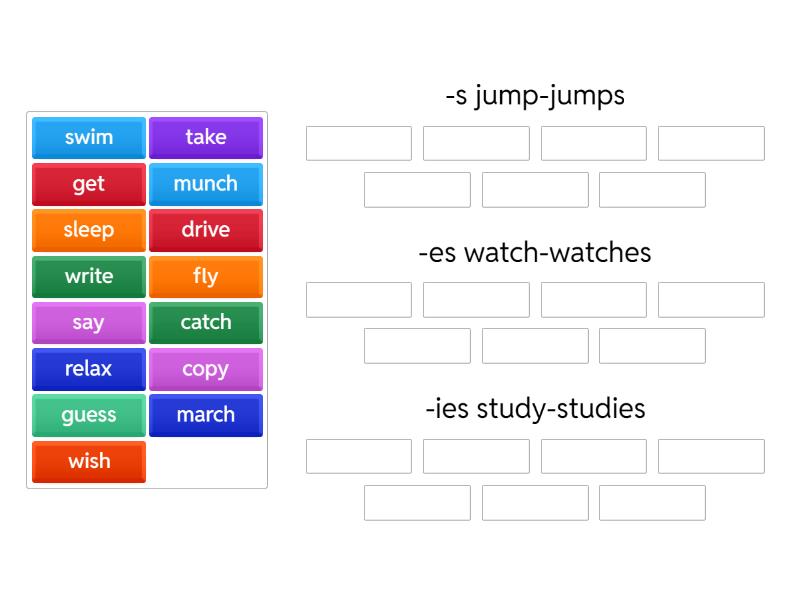 -s jump-jumps: get, sleep, write, swim, take, drive, say, -es watch-watches: relax, munch, march, catch, wish, guess, -ies study-studies: fly, copy,