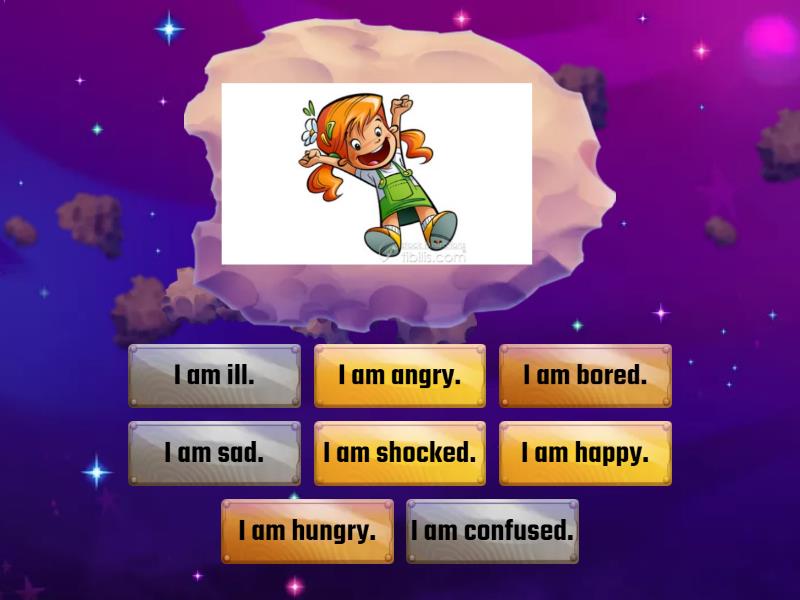 I am happy., I am sad., I am hungry., I am angry., I am confused., I am bored., I am shocked., I am ill.,