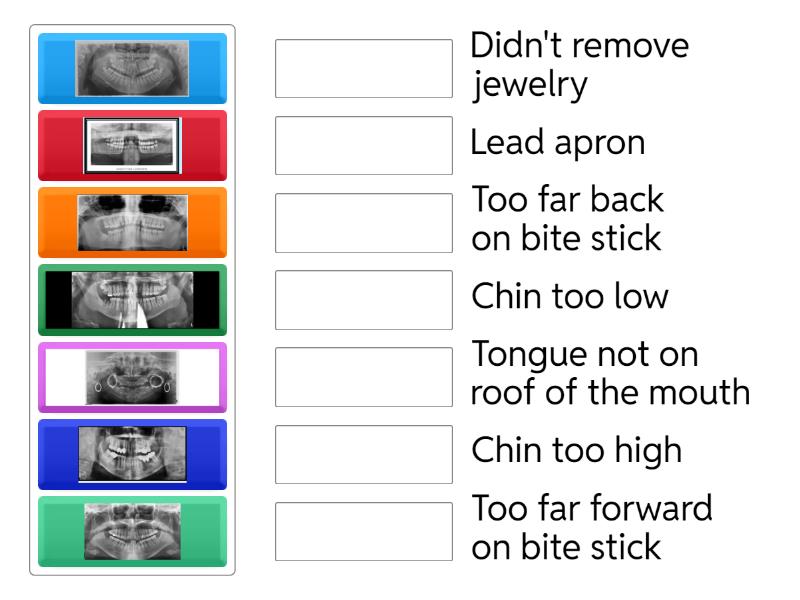 Chin too high, Chin too low, Didn't remove jewelry, Tongue not on roof of the mouth, Lead apron , Too far forward on bite stick, Too far back on bite stick,