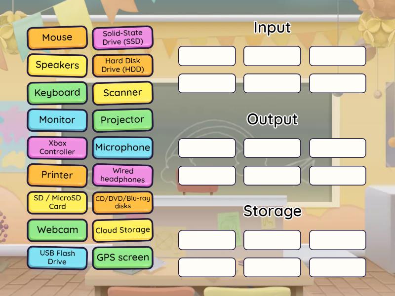 Input: Keyboard, Mouse, Microphone, Webcam, Scanner, Xbox Controller, Output: Monitor, Printer, Speakers, Wired headphones, Projector, GPS screen, Storage: Solid-State Drive (SSD), Hard Disk Drive (HDD), USB Flash Drive, Cloud Storage, SD / MicroSD Card, CD/DVD/Blu-ray disks,