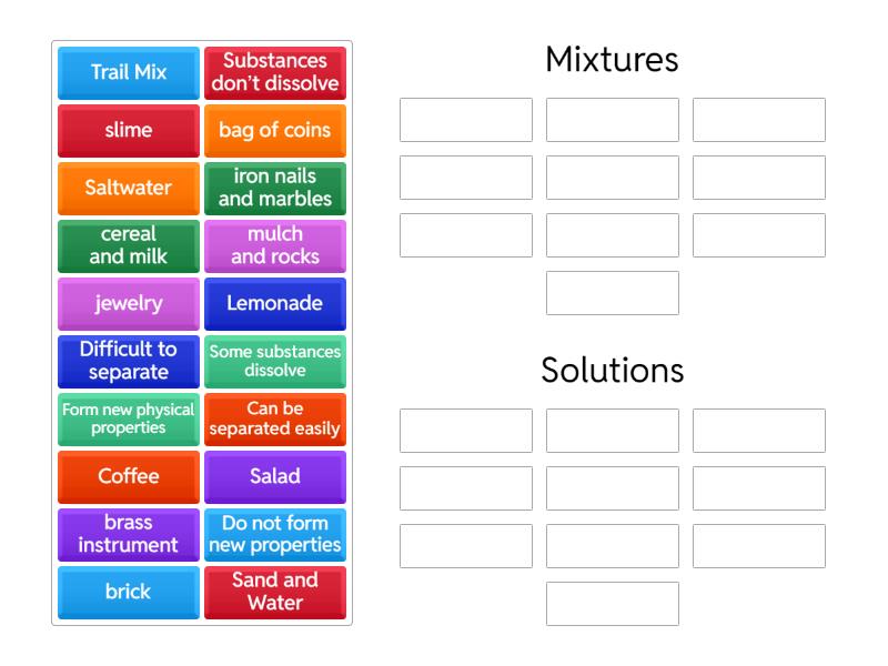 Mixtures: Do not form new properties, Can be separated easily, Substances don’t dissolve, Sand and Water, Salad, Trail Mix, bag of coins, mulch and rocks, cereal and milk, iron nails and marbles, Solutions: Difficult to separate, Saltwater, Form new physical properties, brick, Some substances dissolve, Lemonade, Coffee, jewelry , brass instrument, slime,
