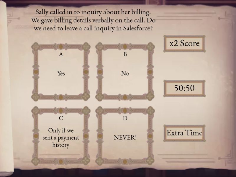 1) Sally called in to inquiry about her billing. We gave billing details verbally on the call. Do we need to leave a call inquiry in Salesforce? a) Yes b) No c) Only if we sent a payment history d) NEVER! 2) Betty received an ad that showed her the price of a supplement for a woman who is 70, she wants to know how much it would cost her at 75. Do we notate? a) Yes b) No c) only if we sign her up for a policy 3) Jaime called to inquire about the billing information for her and her husband's policy. What's the appropriate way to notate this call?  a) Notate Jamie's Policy b) Notate the policy you finished the call with c) Notate whichever policy showed up in attributes d) Notate both policies 4) Kenneth called to ask about Silver Sneakers, you gave him the information for Mutually well. Do you have to notate the policy? a) No b) Yes c) Depends on the info we send d) The system will leave a note 5) Paul called to ask if he needed to do anything with his policy during open enrollment if he does not want to change anything. Do we notate? a) No it was just general information b) Yes Always  6) Susan called to make a payment on her mom's policy. Do we need to notate? a) Yes Always notate the policy b) No it is automatically notated with Salesforce c) I dont know I feel like you are trying to trick me 7) Lynda from Dr. Wayne's office called to check on eligibility and benefits on a med sup policy. Do we need to notate both CAPS & Salesforce? a) No we can notate just Salesforce b) Yes you better notate EVERY SYSTEM 8) Lynda calleb back and actually needs information in regard to a claim from May 2025. After you release all the info what systems must you notate? a) CAPS Only b) CPIS & CAPS c) CPIS, CAPS & SALESFORCE d) CAPS & SALESFORCE 9) Alice called to get the benefit amounts on her Cancer policy. After giving her all the requested information which systems should you notate? a) CPIS b) CAPS & SALESFORCE c) SALESFORCE d) CAPS 10) True or False: Documenting customer interactions helps ensure accurate follow-up and reduces the risk of compliance issues. a) True b) False