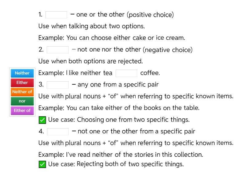 1. ____ – one or the other (positive choice) Use when talking about two options. Example: You can choose either cake or ice cream. 2. ____ – not one nor the other (negative choice) Use when both options are rejected. Example: I like neither tea ____ coffee. 3. ____ – any one from a specific pair Use with plural nouns + “of” when referring to specific known items. Example: You can take either of the books on the table. ✅ Use case: Choosing one from two specific things. 4. ____ – not one or the other from a specific pair Use with plural nouns + “of” when referring to specific known items. Example: I’ve read neither of the stories in this collection. ✅ Use case: Rejecting both of two specific things.