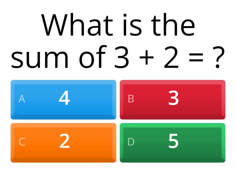 1) What is the sum of 3 + 2 = ? a) 4 b) 3 c) 2 d) 5 2) What is the sum of 3 + 1 = ? a) 4 b) 3 c) 2 d) 5 3) What is the sum of 2 + 1 = ? a) 3 b) 2 c) 1 d) 4 4) What is the sum of 2 + 2 = ? a) 3 b) 2 c) 1 d) 4 5) What is the sum of 2 + 3 = ? a) 3 b) 4 c) 5 d) 1 6) What is 4 + 2 = a) 4 b) 5 c) 6 7) 4 + 3 = a) 7 b) 5 c) 6 8) 5 + 3 = a) 7 b) 8 c) 9 9) 5 + 4 = a) 8 b) 9 c) 10 10) 7 + 2 = a) 9 b) 8 c) 7 11) 7 + 3 = a) 9 b) 10 c) 11 12) 6 + 4 = a) 9 b) 10 c) 11