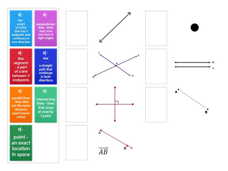 point - an exact location in space, ray - a part of a line that has 1 endpoint and continues in one direction, line - a straight path that continues in both directions, line segment - a part of a line between 2 endpoints, parallel lines - lines that are the same distance apart (never cross), perpendicular lines - lines that cross and form 4 right angles, intersecting lines - lines that cross at exactly 1 point,