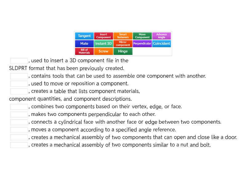 ____, used to insert a 3D component file in the SLDPRT format that has been previously created. ____, contains tools that can be used to assemble one component with another. ____, used to move or reposition a component. ____, creates a table that lists component materials, component quantities, and component descriptions. ____, combines two components based on their vertex, edge, or face. ____, makes two components perpendicular to each other. ____, connects a cylindrical face with another face or edge between two components. ____, moves a component according to a specified angle reference. ____, creates a mechanical assembly of two components that can open and close like a door. ____, creates a mechanical assembly of two components similar to a nut and bolt.