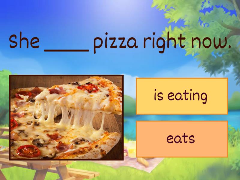 1) She ____ pizza right now. a) is eating b) eats 2) My brother ____ basketball on Thursdays. a) is playing b) plays 3) I ____ Instagram every day. a) am using b) use 4) Homer ____ a shower at the moment. a) is having b) has c) does have 5) Kate usually ____ jeans. a) is wearing b) wears 6) My best friend ____ English classes twice a week. a) is taking b) take c) takes 7) She sometimes ____ a horse at the weekend. a) is riding b) rides 8) We ____ to the cinema once a month. a) are going b) go 9) Spongebob ____ a hat today. a) is wearing b) wears 10) They ____ a series at the moment. a) are watching b) watch 11) This bird often ____ skateboarding. a) is going b) goes 12) This week we __________ a History project. a) prepares b) prepare c) are preparing 13) Look! The old lady ____________ the street without paying atention to the traffic!! a) cross b) is crossing c) crosses 14) Laura never _________ her homework. a) does b) is doing c) do 15) Mary and Sara ___________________with her friends at the weekend. a) is going out b) goes out c) go out