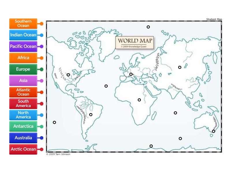 North America, South America, Africa, Europe, Asia, Australia, Antarctica, Atlantic Ocean, Pacific Ocean, Indian Ocean, Arctic Ocean , Southern Ocean.
