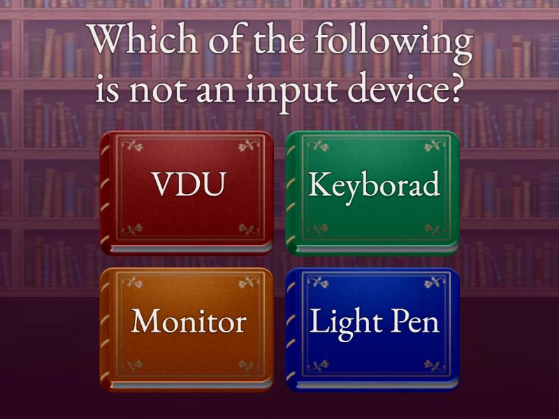 1) Which of the following is not an input device? a) VDU b) Keyborad c) Monitor d) Light Pen 2) A light-sensitive device that converts the printed text, drawing, or other images into digital form is called a) Plotter b) Printer c) Scanner d) OMR 3) Which device has the limitation that we can only read it but cannot modify or erase it? a) Floppy Disk b) Hard Disk c) Tape Drive d) Compact disk 4) Sometimes the mouse pointer moves erratically. This is because of? a) IRQ setting is not proper b) The virus in the system c) Mouse ball is dirty d) The driver is not installed properly 5) The resolution of Laser Printers are specified in terms of ? a) CPM b) PPM c) DPI d) LPM