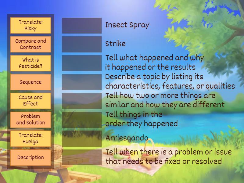 Sequence - Tell things in the order they happened, Cause and Effect - Tell what happened and why it happened or the results, Problem and Solution - Tell when there is a problem or issue that needs to be fixed or resolved, Compare and Contrast - Tell how two or more things are similar and how they are different, Description - Describe a topic by listing its characteristics, features, or qualities, Translate: Risky - Arriesgando, What is Pesticide? - Insect Spray, Translate: Huelga - Strike,