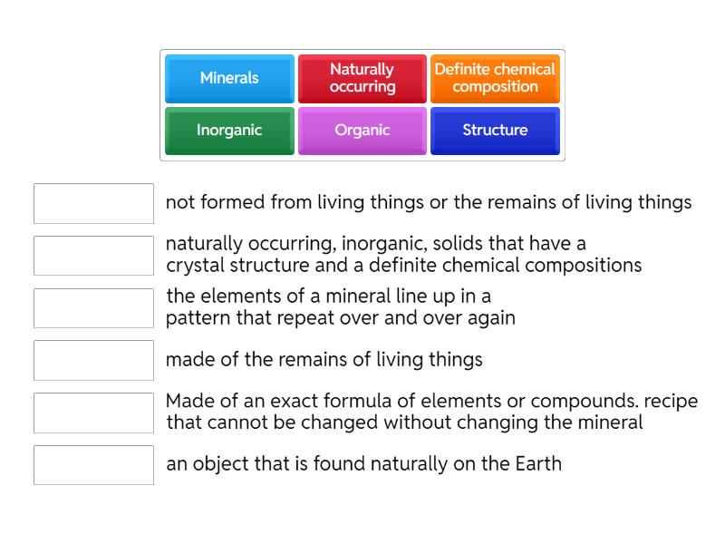 Minerals - naturally occurring, inorganic, solids that have a crystal structure and a definite chemical compositions, Naturally occurring - an object that is found naturally on the Earth, Inorganic - not formed from living things or the remains of living things, Definite chemical composition - Made of an exact formula of elements or compounds. recipe that cannot be changed without changing the mineral, Structure - the elements of a mineral line up in a pattern that repeat over and over again, Organic - made of the remains of living things,