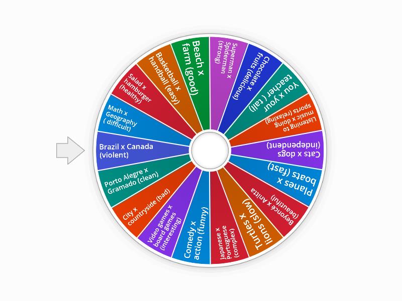 Math x Geography ( difficult), Salad x hamburger (healthy), Basketball x handball (easy), Beach x farm (good), Superman x Spiderman (strong),  Chocolate x fruits (delicious), You x your teacher ( tall), Listening to music x doing sports (relaxing), Cats x dogs (independent), Planes x boats (fast), Beyoncé x Anitta (beautiful), Turtles x lions (slow), Japanese x Portuguese (complex), Comedy x action (funny), Video games x board games (interesting), City x countryside (bad), Porto Alegre x Gramado (clean), Brazil x Canada (violent).