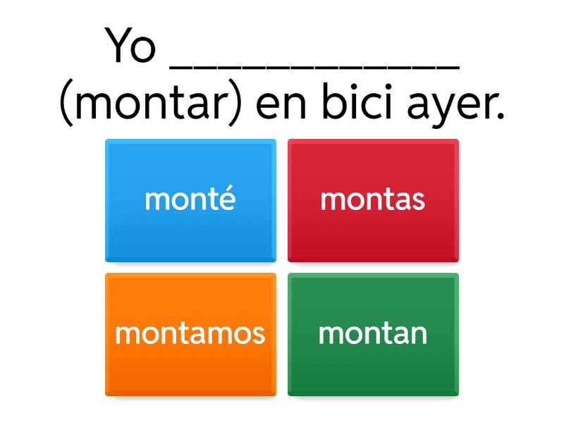 1) Yo ____________ (montar) en bici ayer. a) monté b) montas c) montamos d) montan 2) Tú ____________ (hablar) con tu amigo. a) hablé b) hablaste c) hablan d) hablamos 3) Él ____________ (bailar) en la fiesta. a) bailé b) bailaste c) bailó d) bailan 4) Nosotros ____________ (estudiar) para el examen. a) estudié b) estudiamos c) estudian d) estudiaste 5) Vosotros ____________ (cantar) en el coro. a) cantaron b) cantasteis c) canto d) cantamos 6) Ellos ____________ (trabajar) en el proyecto. a) trabajé b) trabajaron c) trabajas d) trabajaste 7) Yo ____________ (nadar) en la piscina. a) nadé b) nadaste c) nadamos d) nadan 8) Tú ____________ (comprar) un regalo. a) compraste b) compró c) compramos d) compran 9) Ella ____________ (escuchar) música. a) escuché b) escuchaste c) escuchó d) escuchan 10) Nosotros ____________ (viajar) a España. a) viajé b) viajaron c) viajamos d) viajas 11) Vosotros ____________ (pintar) un cuadro. a) pintaron b) pintasteis c) pintamos d) pinto 12) Ellas ____________ (cocinar) la cena. a) cociné b) cocinaron c) cocinas d) cocinaste 13) Yo ____________ (caminar) por el parque. a) caminé b) caminaste c) caminamos d) caminan 14) Tú ____________ (dibujar) un retrato. a) dibujé b) dibujaste c) dibujamos d) dibujan 15) Él ____________ (limpiar) su habitación. a) limpié b) limpiaste c) limpió d) limpian 16) Nosotros ____________ (jugar) al fútbol. a) jugué b) jugaron c) jugamos d) juegan 17) Vosotros ____________ (saltar) la cuerda. a) saltaron b) saltasteis c) saltamos d) salto 18) Ellos ____________ (pescar) en el lago. a) pesqué b) pescaron c) pescas d) pescaste