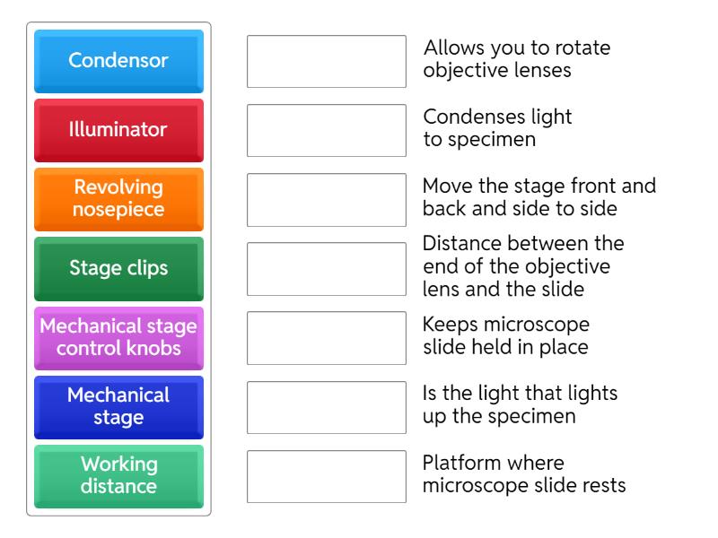 Mechanical stage - Platform where microscope slide rests, Mechanical stage control knobs - Move the stage front and back and side to side, Illuminator - Is the light that lights up the specimen , Condensor - Condenses light to specimen, Ocular Lens - Magnification of 10x, Coarse adjustment knob - Moves stage up and down faster and farther, Fine adjustment knob - Moves stage up and down slower , Field of view - The diameter of the circle of view you can see, Working distance - Distance between the end of the objective lens and the slide, Depth of focus - When you can see top, bottom, and intermediate layers of a specimen, Revolving nosepiece - Allows you to rotate objective lenses, Stage clips - Keeps microscope slide held in place , Iris diapragm - Controls how much light hits the specimen,