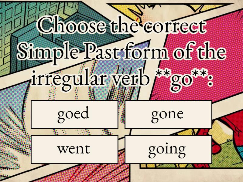 1) Choose the correct Simple Past form of the irregular verb **go**: a) goed b) gone c) went d) going 2) Choose the correct Simple Past form of the irregular verb **take**: a) took b) taked c) taken d) taking 3) She ____ (make) a delicious cake yesterday. a) is making b) maked c) makes d) made 4) What is the Base Form of the irregular past tense verb drove? a) drove b) drive c) driving d) driven 5) Choose the correct negative form of the following sentence in the Simple Past:She liked the movie. a) She doesn't like the movie. b) She not liked the movie. c) She didn't like the movie. d) She didn't liked the movie.