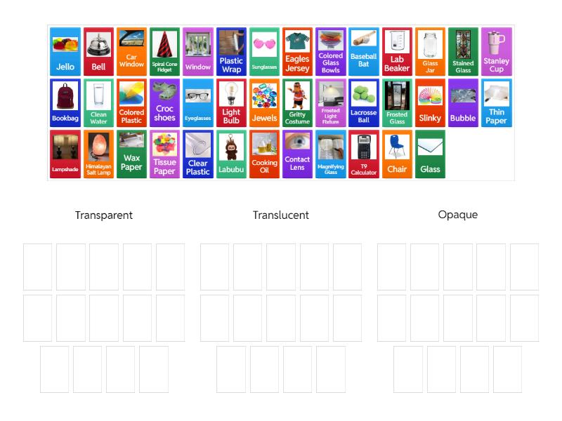 Transparent: Glass, Clear Plastic, Lab Beaker, Light Bulb, Eyeglasses, Magnifying Glass, Window, Bubble, Clean Water, Glass Jar, Car Window, Plastic Wrap, Contact Lens, Translucent: Tissue Paper, Sunglasses, Colored Plastic, Lampshade, Thin Paper, Frosted Glass, Jewels, Jello, Cooking Oil, Wax Paper, Stained Glass, Himalayan Salt Lamp, Colored Glass Bowls, Frosted Light Fixture, Opaque: Stanley Cup, Labubu, Spiral Cone Fidget, Eagles Jersey, Gritty Costume, T9 Calculator, Slinky, Bell, Chair, Lacrosse Ball, Baseball Bat, Bookbag, Croc shoes,