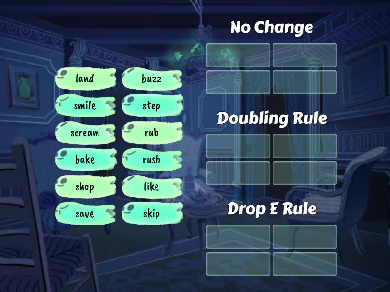 No Change: rush, buzz, land, scream, Doubling Rule: rub, step, shop, skip, Drop E Rule: bake, like, save, smile,