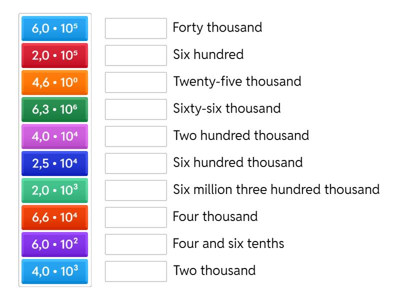 2,0 • 10³   - Two thousand  , 2,5 • 10⁴   - Twenty-five thousand , 2,0 • 10⁵   - Two hundred thousand , 4,6 • 10⁰   - Four and six tenths , 4,0 • 10³   - Four thousand , 4,0 • 10⁴   - Forty thousand , 6,0 • 10²   - Six hundred , 6,6 • 10⁴   - Sixty-six thousand , 6,0 • 10⁵   - Six hundred thousand , 6,3 • 10⁶ - Six million three hundred thousand,