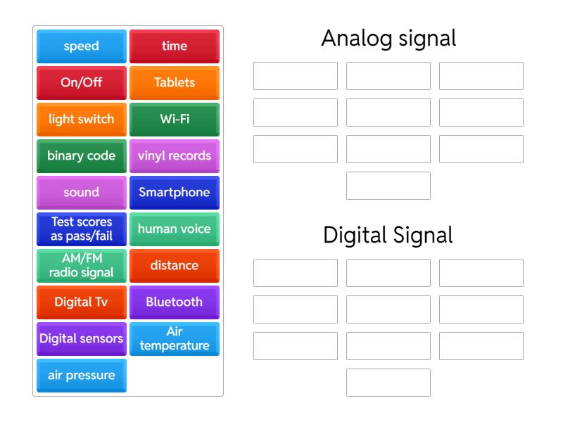 Analog signal: Air temperature, sound, air pressure, distance, time, speed, human voice, AM/FM radio signal, vinyl records, Digital Signal: Test scores as pass/fail, binary code, light switch, On/Off, Digital Tv, Digital sensors, Wi-Fi, Bluetooth, Smartphone, Tablets,