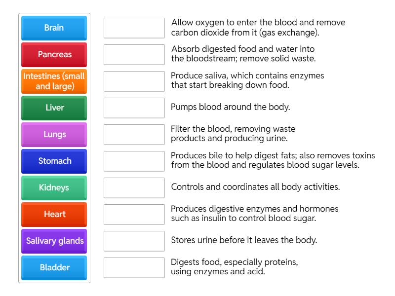 Brain - Controls and coordinates all body activities., Kidneys - Filter the blood, removing waste products and producing urine.​, Bladder​ - Stores urine before it leaves the body.​, Stomach​ - Digests food, especially proteins, using enzymes and acid.​, Liver​ - Produces bile to help digest fats; also removes toxins from the blood and regulates blood sugar levels.​, Lungs​ - Allow oxygen to enter the blood and remove carbon dioxide from it (gas exchange).​, Heart​ - Pumps blood around the body.​, Salivary glands​ - Produce saliva, which contains enzymes that start breaking down food.​, Pancreas​ - Produces digestive enzymes and hormones such as insulin to control blood sugar.​, Intestines (small and large)​ - Absorb digested food and water into the bloodstream; remove solid waste.​,
