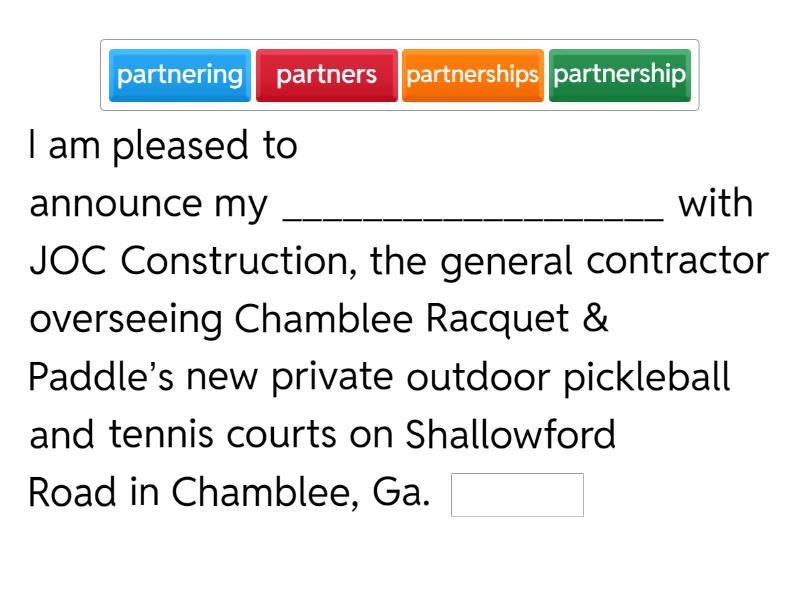 I am pleased to announce my ___________________ with JOC Construction, the general contractor overseeing Chamblee Racquet & Paddle’s new private outdoor pickleball and tennis courts on Shallowford Road in Chamblee, Ga. ____ JOC Construction owner Matt Noonan and his team have over 25 years of experience in land development and site _____________________. ____ Along with the help of Breedlove Land Planning, we are poised ____________ ready to break ground.____ As our excellent engineers _________________ the complex systems needed for stormwater management, ADA accessibility and code compliance, our conceptual drawing has matured into the gorgeous site plan below.____ Our team has been _________________ portable pickleball packages all over Atlanta. Private residents, Atlanta businesses and HOA communities have been able to experience pickleball in their driveways, parking lots, warehouses, gyms and community centers.____ Our team ___________ love to put together a quote for your next event. Send us an email with all the details to ChambleeCourts@Gmail.com.____ It’s hard to wait for the match to begin but, we’re not sitting idle during the development phase. Here are some of the things we’re _______________ on:____ Flexible Membership Plans & Perks: Whether you ___________ to play pickleball / tennis once a year or seven days a week, we will have flexible play plans that suit every athlete.____ COURT-SIDE CONCESSIONS: Like magic, your drinks and snacks ____________ ready and waiting for you in rental coolers at your court when you order in advance.____ We’re stoked __________________ our “Get Out & Play” program which is all about helping you find more ways to enjoy the sports you love at the appropriate level. ____ We know that you, the customer, can provide essential feedback on what policies and programming you ______________. ____ You will be able to make a suggestion to any ______________ on site and they will print it up for review at our monthly staff meetings.____ Owner Jill Flournoy will be hosting a series of social gatherings to hear your ideas __________ suggestions. ____ The dates and times will be posted on our website’s calendar once they are scheduled and you will be able to ________________ online.____