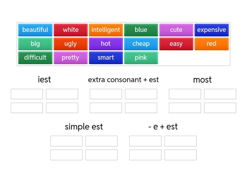 iest: ugly, pretty, easy, extra consonant + est: big, hot, red, most: beautiful, intelligent, difficult, expensive, simple est: smart, cheap, pink, - e + est: blue, cute, white,