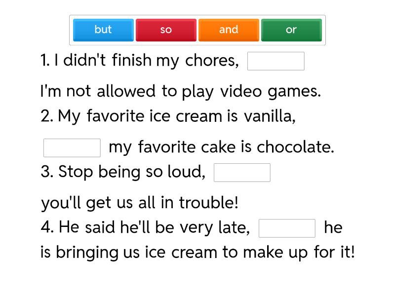 1. I didn't finish my chores, ____ I'm not allowed to play video games. 2. My favorite ice cream is vanilla, ____ my favorite cake is chocolate. 3. Stop being so loud, ____ you'll get us all in trouble! 4. He said he'll be very late, ____ he is bringing us ice cream to make up for it!