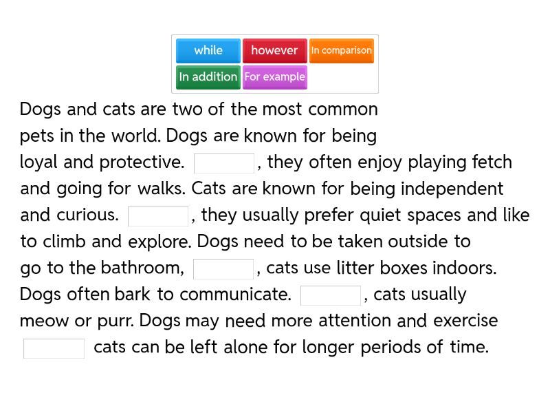 Dogs and cats are two of the most common pets in the world. Dogs are known for being loyal and protective. ____, they often enjoy playing fetch and going for walks. Cats are known for being independent and curious. ____, they usually prefer quiet spaces and like to climb and explore. Dogs need to be taken outside to go to the bathroom, ____, cats use litter boxes indoors. Dogs often bark to communicate. ____, cats usually meow or purr. Dogs may need more attention and exercise ____ cats can be left alone for longer periods of time.