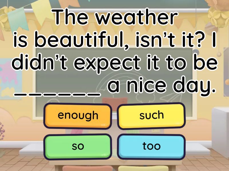 1) I didn’t like the book. The story was _______ stupid. a) such b) so c) too d) enough 2) The weather is beautiful, isn’t it? I didn’t expect it to be ______ a nice day. a) too b) such c) so d) enough 3) Some of us had to sit on the floor because there weren’t _____ chairs. a) some b) enough c) so d) too 4) The wallet was _____ big to put in my pocket. a) enough b) too c) so d) such 5) It’s _____ a interesting book. a) so b) such c) too d) enough 6) I’m surprised you haven’t heard of her. She’s _____ famous. a) so b) too c) such d) enough 7) That shirt is _____ small for you. You need a larger size. a) enough b) too c) so d) such 8) I like Liz and Joe. They are _____ nice. a) too b) so c) enough d) such 9) It was _____ beautiful day we decided to go to the beach. a) so a b) such a c) enough a d) too a