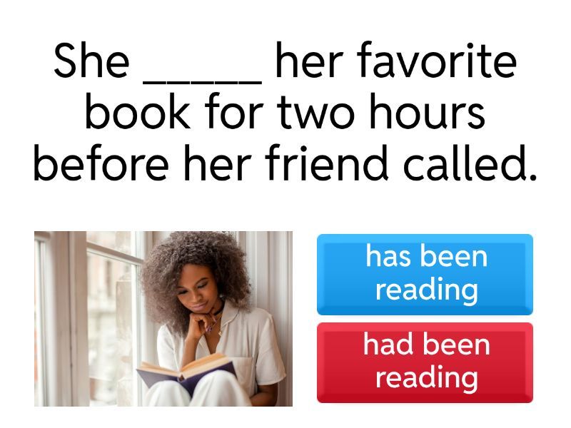 1) She _____ her favorite book for two hours before her friend called. a) has been reading b) had been reading 2) The students ____ for the test in the classroom when the teacher came in.  a) had been prepare b) had been preparing 3) I _______ the piano for weeks before the concert. 🎹 a) had practicing b) had been practicing 4) He had been running in the park for an hour when suddenly the rain _____. a) start b) started 5) We ______ for 40 minutes when the bus finally arrived. a) had been waiting b) were waiting 6) You _____  for 2 minutes before you got to this question, right? a) had been play b) had been playing 7) It ______ heavily last night, so yesterday morning the streets _____ full of snow ❄️ a) has been snowing / are b) had been snowing / are c) had been snowing /  were