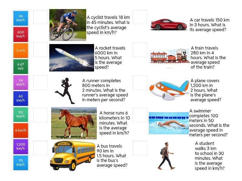 50 km/h - A car travels 150 km in 3 hours. What is its average speed?, 6.67 m/s - A runner completes 800 meters in 2 minutes. What is the runner’s average speed in meters per second?, 70 km/h - A train travels 280 km in 4 hours. What is the average speed of the train?, 24 km/h - A cyclist travels 18 km in 45 minutes. What is the cyclist’s average speed in km/h?, 600 km/h - A plane covers 1,200 km in 2 hours. What is the plane’s average speed?, 6 km/h - A student walks 3 km to school in 30 minutes. What is the average speed in km/h?, 2 m/s - A swimmer completes 100 meters in 50 seconds. What is the average speed in meters per second?, 60 km/h - A bus travels 90 km in 1.5 hours. What is the bus’s average speed?, 36 km/h - A horse runs 6 kilometers in 10 minutes. What is the average speed in km/h?, 1,200 km/h - A rocket travels 6000 km in 5 hours. What is the average speed?,