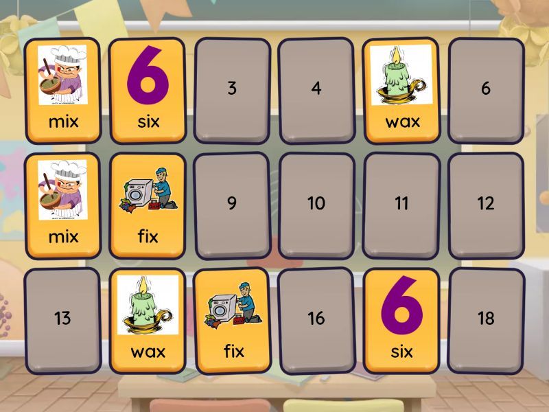 six, mix, fix, wax, tax, fax, ox, ax, sax,